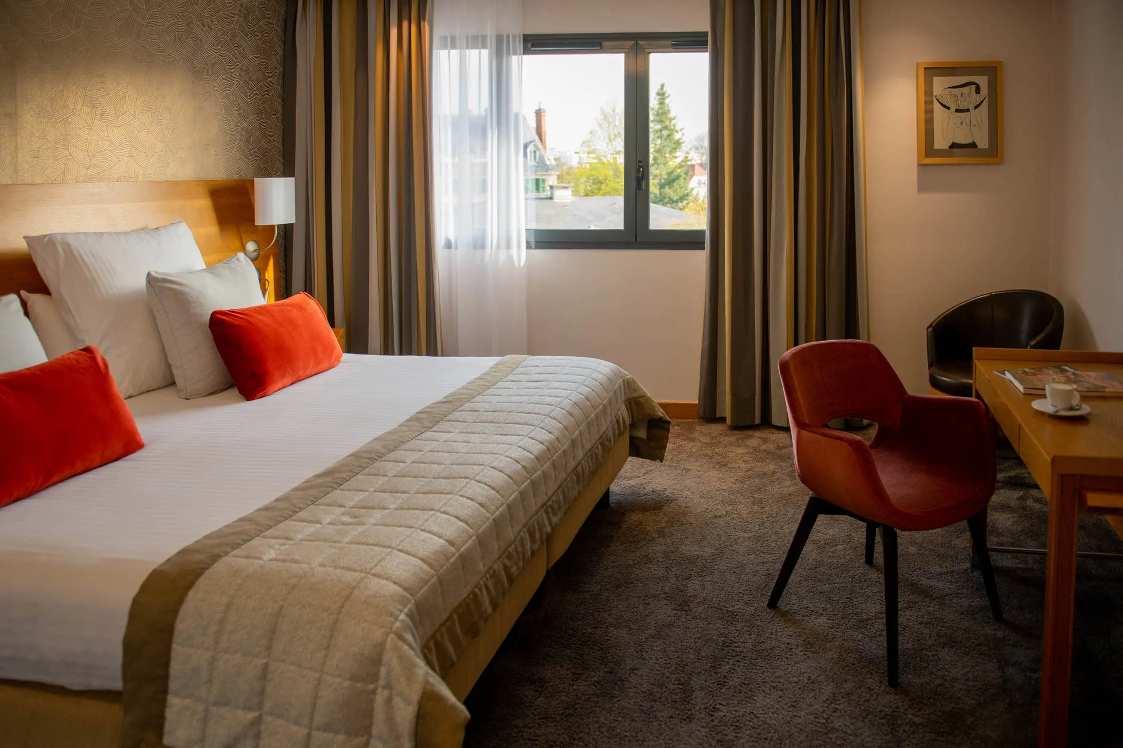 Que vous choisissiez une chambre côté ville, une chambre avec vue sur le parc ou l’une de nos suites, vous serez séduit par l’atmosphère feutrée, la décoration soignée et l’espace généreux, propices au repos et à la détente.